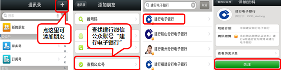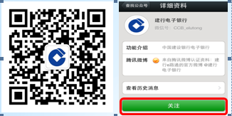 您也可通过微信客户端选择“通讯录”-“添加朋友”-“查找公众号”搜索“中国建设银行”进行关注。