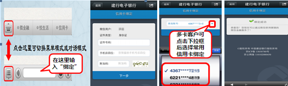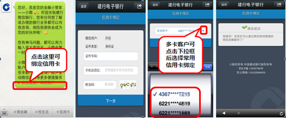 成功添加“中国建设银行”公众账号后,可通过以下几种方式验证身份后完成信用卡绑定