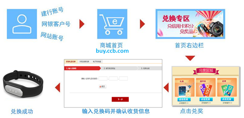 (5)获奖持卡人登录中国建设银行善融商务个人商城(buy.ccb.com),在商城首页“右边栏”点击“兑换专区”,在“兑奖区域”礼品图片下的“点击兑奖”按钮,输入礼品兑换码,填写手机号码及收货地址等信息,提交后等待配送。礼品兑换截止日期为2016年5月31日,若截止日期前未能完成礼品兑换,视为客户主动放弃所赠礼品,礼品不予补发。