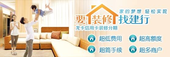 中国建设银行为您特别推出“龙卡信用卡装修分期付款”产品,0利息,低手续费,可在建材、装修、装潢、家具类等商户灵活使用,专享分期额度,不影响正常刷卡消费,缓解您贷款买房后装修新家、购买家俱等一系列资金压力,助您实现精彩设想,尽快享受惬意新居,更为您带来理财新概念。